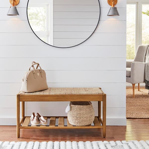Welcome guests to casual, coastal-inspired elegance with the Hamlin Woven Bench, exclusively offered online at The Home Depot by the Home Decorators Collection. This bench is meticulously crafted with a natural, handwoven banana-fiber seat that brings textured and relaxed warmth to any room. The woven seat is expertly adhered to a backless, solid wood frame with a slatted lower shelf that offers durability and practicality for lasting use. The frame is finished in a neutral patina or black stain that perfectly pairs with your existing furniture and decor. Whether you're looking for a practical seating solution at the dining table or a statement piece in your entryway, the Hamlin Woven Bench effortlessly embraces the organic allure of coastal living while bringing casual warmth and texture to your space. Be sure to check out the other exclusive pieces in the Hamlin Woven Collection to elevate your home's aesthetic with the timeless appeal of coastal style - seamlessly blending natural textures and warm wood tones for an inviting ambiance.