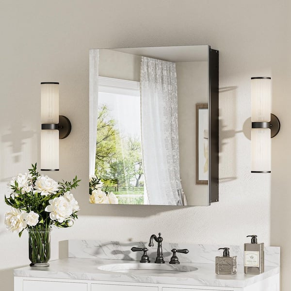 Mirrored surfaces outside and aluminum metal inside, this 20 in. H frameless medicine cabinet helps you put your best face forward. Mirror on the front door features a flat edge for enhanced style. Inside, adjustable glass shelves easily accommodate your toiletries.