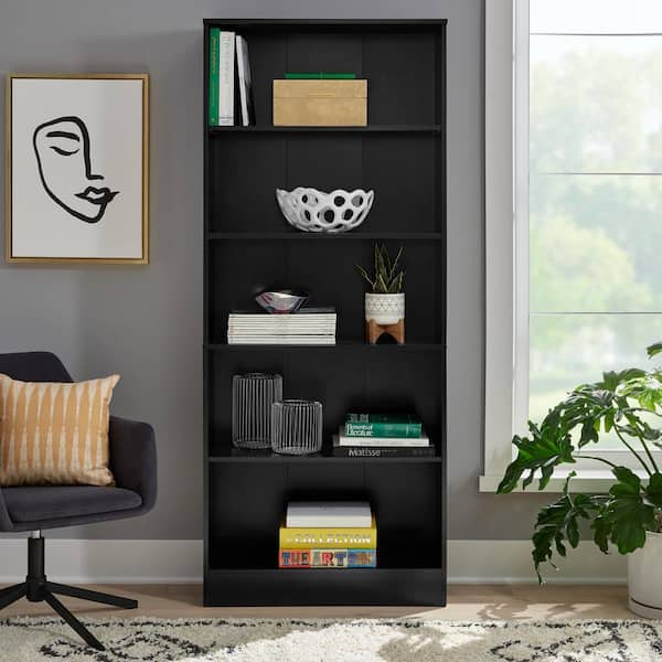 Showcase treasured collections on this black StyleWell five-shelf standard bookcase. The adjustable shelves make it easy to customize the setup to accommodate tall vases and other accents, while the finished back creates a perfect backdrop for display pieces. This StyleWell five-shelf standard bookcase is constructed from particle board and mdf wood for strength and durability and finished in a black laminate. The neutral black finish complements a range of decor themes and is sure to bring classic style to your living room, bedroom or den.